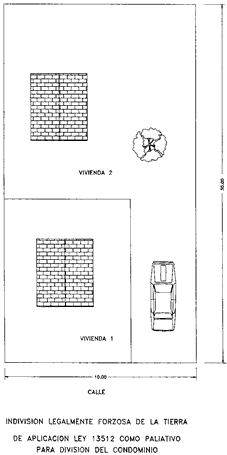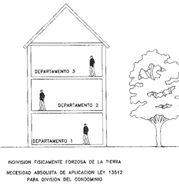 Aplicando la Ley 13512 de Propiedad Horizontal se dividen también edificios, cuyo enclave en el predio sobre el que se asentaban, no tenían la característica del esquema anterior, sino que la indivisión de la tierra se transformaba, como consecuencia de las medidas mínimas de las parcelas establecida por las reglamentaciones vigentes, originándose subdivisiones bajo este régimen, de las siguientes características: