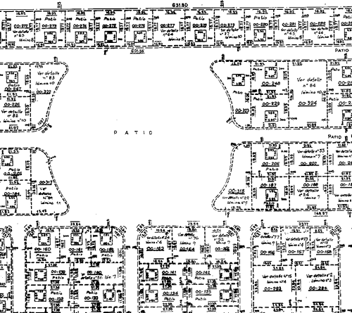 De esta forma se originan unidades funcionales, cada una de las cuales posteriormente una vez construida conformará una unidad de vivienda y tanto los espacios circulatorios interiores al complejo como los comunes de esparcimiento, pasan a ser patios dentro del régimen de la ley 13512, tal el siguiente esquema de un plano de subdivisión:
